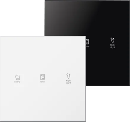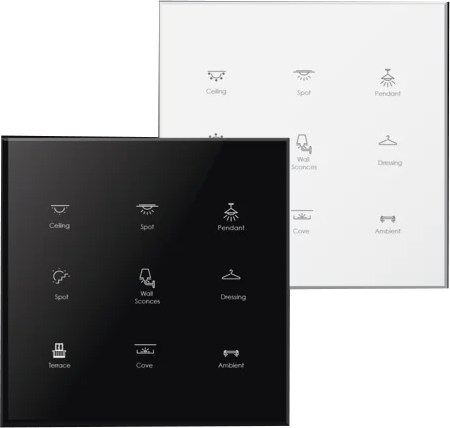 The Roomio Glass Collection comes in 3×3 and 3×4 configurations with up to 12 touch-points and a thermostat version with a built-in temperature and humidity sensors. The keypads are available in any color.